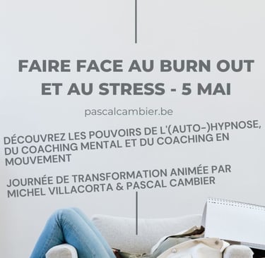Explorez les Pouvoirs de l'(Auto-)Hypnose, du Coaching Mental et du Coaching en mouvement lors de notre Journée Anti Burn-Out, animée par deux experts ! Vous repartirez avec la clé vous permettant de protéger efficacement votre intégrité psychique et mieux gérer émotionnellement les situations de burn-out, harcèlement ou stress divers.