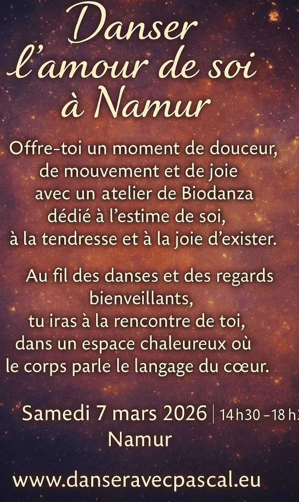 Rejoignez-nous le samedi 7 mars 2026, de 14h30 à 18h30 à Namur, pour un atelier de biodanza placé sous le signe du mouvement, de la présence et de la bienveillance. Dans une ambiance conviviale, vous serez invité·e à vous reconnecter à votre corps, à vos émotions et à la joie simple d’être vous. La biodanza est une belle manière de transformer la quête de reconnaissance extérieure en une rencontre vivante avec votre propre essence.